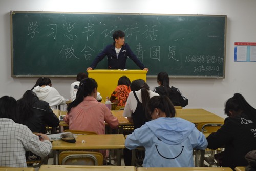 各班组织的主题团会形式多样,内容丰富。参会团员在团支书带领下深入学习了习近平总书记系列重要讲话,重温了共青团的历史、使命和入团誓词,每名团员在团课上认真诚恳地进行了承诺。2016级统计与会计核算、2016级财务管理1班、2016级财务管理2班、2016级金融管理等班级请高年级员工党员给团员讲解团课知识及发展老员工党员的流程,希望同学们要努力向党组织靠拢,积极参加活动,认真对待学习。2016级连锁管理班何志强同学在提及为什么要加入共青团时,回答说,因为共青团是一群思想积极分子的组织,是党的预备军,他想在其中提升自己的思想水平;2016级物流班李丹丹同学,提到作为一名合格班级团支书不仅要严格执行团员的章程和组织原则,还要为青年带好头,争当青年团员的模范,与同学互帮互助。主题团会上,大家踊跃发言,还就如何做好班级共青团工作,履行团员职责发表自己的意见。
