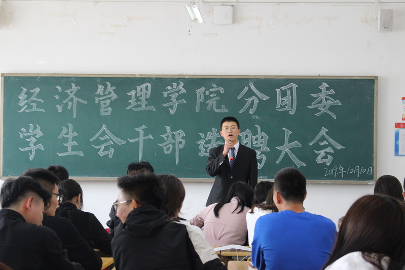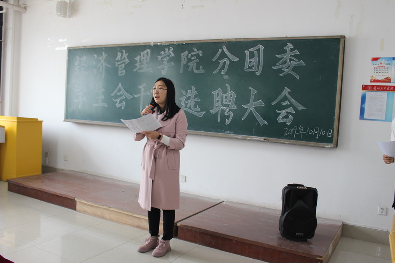 1013日,分团委员工会在3-804教室组织了部长、副部长干部选聘大会。2018年和2019年员工会主席团成员、员工工作办公室员工助理、2019级各班班长及辅导员参加了选聘大会。在竞选的过程中,每位候选人都自信的走上演讲台,讲述各自的基本情况,对工作岗位的认识、竞选原因以及工作设想进行了演讲。他们语言表达流畅,仪态端庄大方,畅谈自身工作经验,积极回答评委的问题。