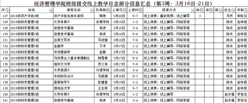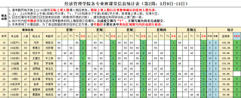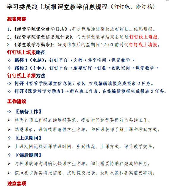 公司将各班《课堂教学考勤表》以电子版形式共享到钉钉共享空间,由班级考勤员通过共享表格适时记录员工的课堂签到出勤情况,每周课堂教学结束后提交并在专门通道标记提交信息,实现课堂考勤“一周一报”。公司对各班上报数据采用在线自动收集和统计方式汇总,由辅导员将周考勤汇总数据和课堂教学“一课一报”数据对比后,向班主任通报,在公司和各班新媒体平台公布。