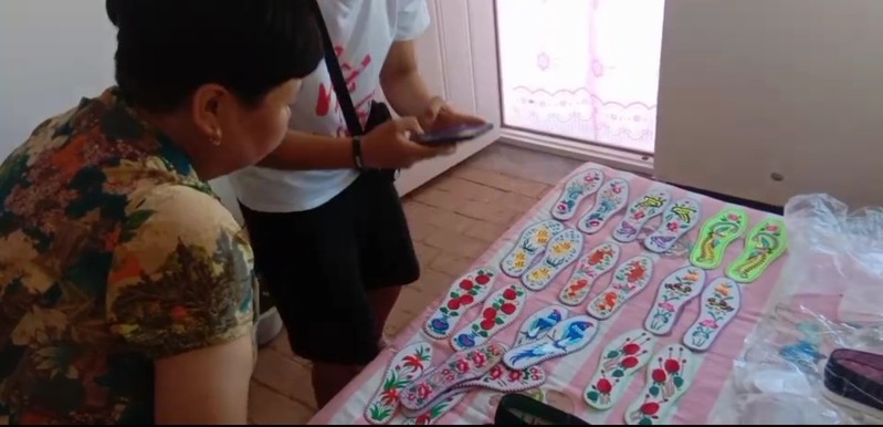 7月22日下午,队员们来到桐川镇的刺绣手工艺品店,老板热心的接待了队员们,大家一起对店铺进行收拾整理。讨论推广产品的种类和闪光点以及介绍的顺序。大家集思广益,提出了许多有效可行的办法。之后在网上查阅了庆阳刺绣的相关文献,做足准备。准备工作完成后,在店主的快手账号上发起了直播,下午六点,直播正式开始。在直播间内,实践队员发挥出自己的特色,与观众紧密互动。以老乡亲切的口吻与直播间内的观众交流介绍,略显夸张喜庆的介绍方式拉近了与观众的距离,活跃了气氛。待时机成熟,观众较多的时候,实践队员们有条不紊的按照前期筹划的内容和次序对刺绣产品进行了介绍。如刺绣布鞋、刺绣拖鞋、刺绣枕头等工艺品,详细向观众说明了制作流程、刺绣寓意以及使用场合。突出了庆阳刺绣的特点,受到了观众的喜爱,纷纷发弹幕询问商品价格,直播间的气氛上升到了高潮。整个直播过程气氛热烈,弹幕互动不断,实践队员积极认真回答观众们的问题,用最直观的感受介绍农产品,用真诚的态度与耐心的解答,推荐适合观众使用的刺绣产品。