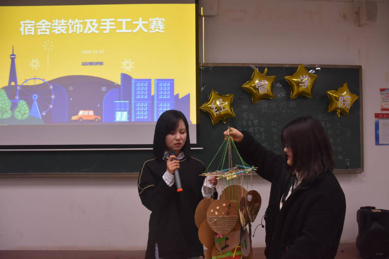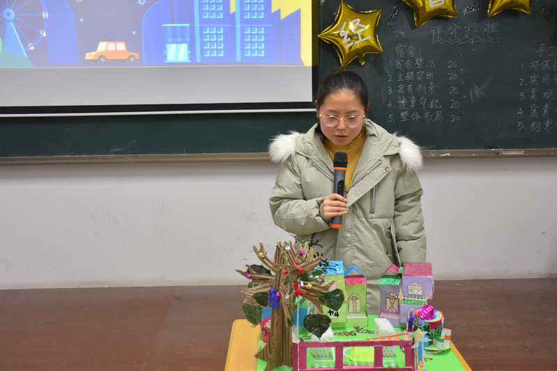 首先由主持人宣讲了本次大赛的活动流程、评选标准。其次,参赛宿舍的舍长向同学们的展现各自小家一幅幅温馨、多彩的画卷和新颖独特的手工作品。温馨的小家让我们感受到了宿舍气氛和谐、学习氛围浓厚。多个手工作品充分体现出了手工作品大赛绿色环保的主题思想。最后,由主席团成员为获奖宿舍颁发了荣誉证书和奖品,并鼓励获奖宿舍再接再厉。
