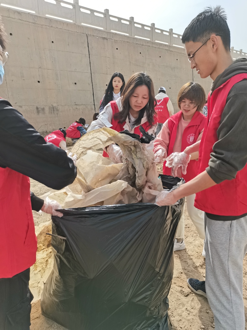 28日早上,大家又相约在公司图书馆前集合,由辅导员贾欢欢带队再次前往活动地点。所有参加活动的员工都身着红色志愿服,出校门后列队整齐,走在路上成为大家的焦点,引来很高的回头率,成为一道亮丽的风景线。到达活动地后进行了简单的分组,很快开始行动。下到河边后,辅导员带头捡出压在泥沙里的塑料袋等垃圾,其他同学也很快进入到活动中。 活动中各组同学明确分工,有人撑着垃圾袋,有人捡垃圾,有的时候两人一起扯出埋的比较深的垃圾。活动中所有员工将热情转化为力量,两个小时后每组的垃圾袋都已经“慢慢当当”。大家协作将自己的“成果”陆续运出河滩。因为垃圾太多,部分垃圾太重,无法将其搬至集中回收地。辅导员到处联系垃圾转运车,将其运走。