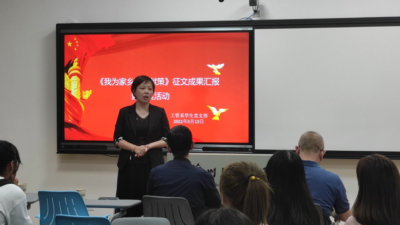 工管系员工党支部举办“我为家乡建言献策”征文成果汇报会2021年是中国共产党建党100周年,也是“十四五”开局之年。在这特殊的历史节点,为向党的100岁生日献礼,工管系员工党支部于5月13日举办了“我为家乡建言献策”征文成果汇报暨颁奖主题党日活动。公司党总支书记王迎春,副经理石晶,教工党支部书记王生荣、王静、张金香,办公室主任苏文龙,组织员胡琪雅及各员工党支部支委成员,工管系员工支部全体党员参加活动。