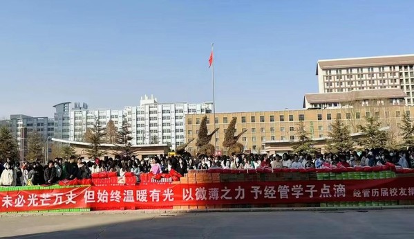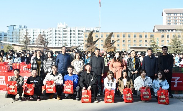 之后由参会嘉宾与经管公司教师代表,员工代表向在校生代表分发了此次活动的爱心大礼包。