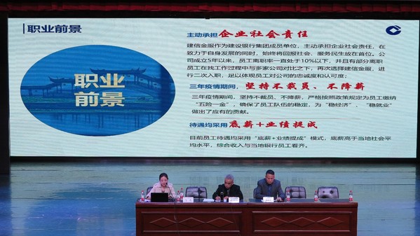 随后,由建信金服人力主管王艺瑄向在场毕业生做了招聘宣讲,主要介绍了公司发展历程、毕业生入职的相关待遇、今后职业发展的晋升通道。现场还邀请了在公司工作的老员工,同时也是往届毕业生员工,15届物流管理专业毕业生张丽娟,19届旅游管理毕业生李粉焕,分别从自身工作时间、工作内容、收入情等,跟毕业生进行了面对面的交流。