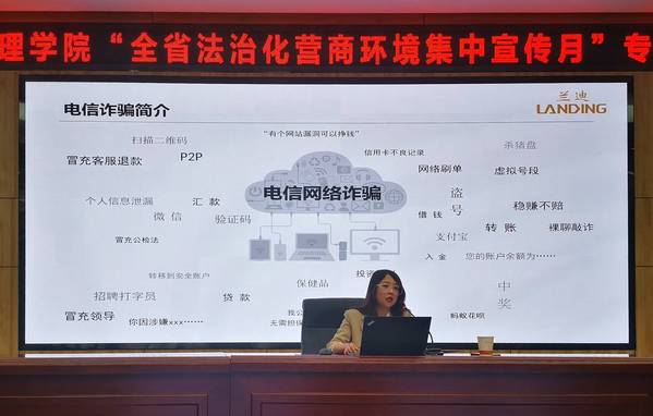 律师付璐结合发生在高校的网络兼职刷单、冒充淘宝客服、虚假投资理财、虚假网络贷款、冒充公检法诈骗、代办信用卡等方式进行诈骗的典型案例,提醒广大师生要提高电信网络诈骗识别能力,谨记“无论骗术怎么变,不转账应万变!”,做到不轻信不明对象及可疑信息及链接不因贪小利而受违法短信息的诱惑不拨打短信息中的陌生电话绝不向任何人提供手机验证码不泄露个人信息“五不要”,不给不法分子留下可乘之机,并介绍了遭遇诈骗后的应急措施和具体操作建议。