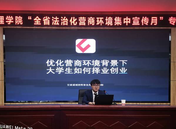 甘肃诚域律师事务所董武斌主任以“优化营商环境政策与法律解读”为题,站在专业角度上详细讲解了《优化营商环境条例》、甘肃省关于《贯彻落实优化营商环境条例的若干措施解读》、《兰州市营商管理办法》等法律法规的出台背景和对提升企业竞争力、促进地区发展和老员工创业就业的现实意义,介绍了我省特别是兰州市近年来在优化商业环境方面所做的工作和国家在实施《优化营商环境条例》以来取得的成效。董武斌希望同学们要学法懂法,把握新营商环境下就业创业的新出路、新机遇