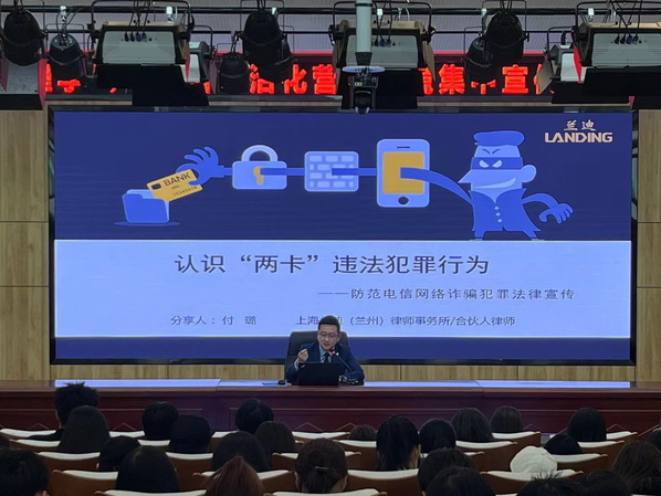 上海兰迪(兰州)律师事务所合伙人律师贾玉雯和付璐围绕认识“两卡”违法犯罪行为和防范电信网络诈骗犯罪法律主题结合工作中的真实案例,要求同学们平时要妥善保管好自己的各类身份和卡片信息,正确处理个人闲置电话卡、银行卡,严格做到不借、不售、不租个人电话卡和银行卡。
