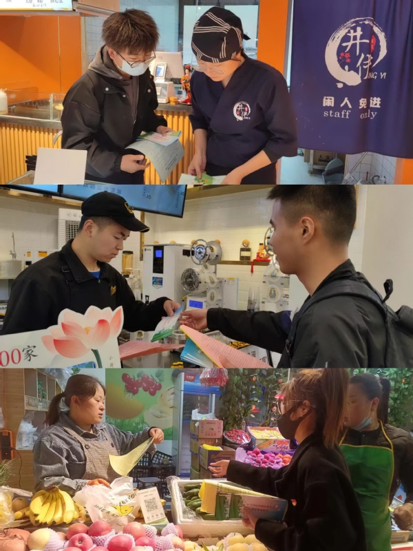 4月27日和28日,金融系员工党支部和法学社社员,分批前往校内外商铺开展专题宣传活动。大家积极走向商户,发放优化营商环境宣传单,耐心细致地讲解优化营商环境的重要意义,解读与经营主体息息相关的条例、扶持政策等。提高了校内外商户对优化营商环境法律法规的知晓度,提升了商户维护营商环境的意识,形成了“人人关心营商环境、人人维护营商环境”的良好宣传氛围。 通过此次宣传活动,在公司及周边掀起了“全省法治化营商环境集中宣传月”的高潮。临近五一假期,此次法治化营商环境的宣传和学习有助于员工假期感受营商环境优化的便利,更有助于大家在日常生活中维护营商环境。 撰稿:贾欢欢 摄影:法学社马媛 通讯员:汪莹 初审:王迎春 撰稿: