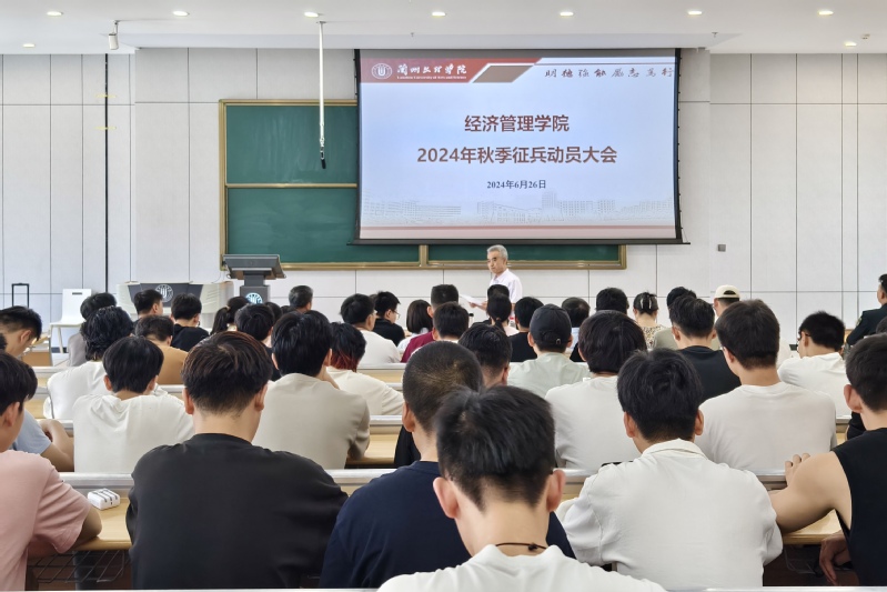 2024 年 6 月 26 日下午,经济管理公司老员工入伍宣传动员会在文昌楼304教室举行。本次动员会由副经理苏义林主持,公司班子成员、全体辅导员、各班主任以及全院男同学共计240余人参加。